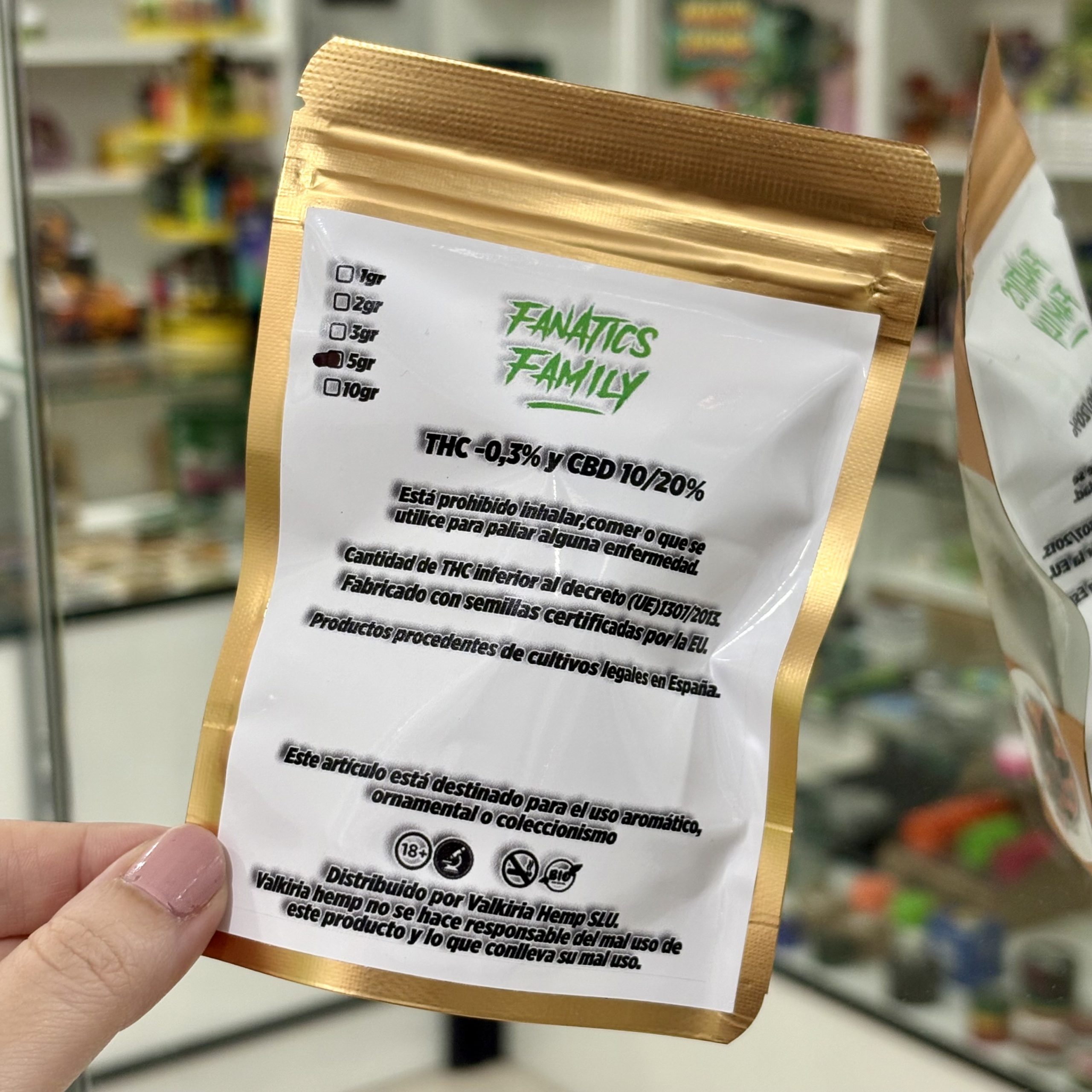 La flor de Marijuana indoor CBD (genética USA) de Fanatics Family es una Northern Lights. El aroma de esta variedad destaca por su aroma envolvente, notas frescas, cítricas y terrosas con esencia a pino.