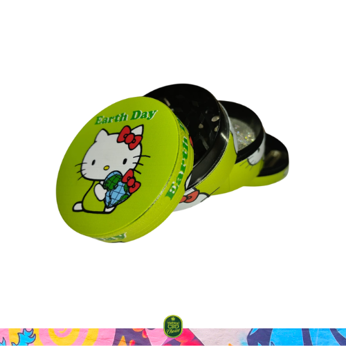 Grinder de metal de 4 partes + espátula con diseño Kitty Earth Day verde.