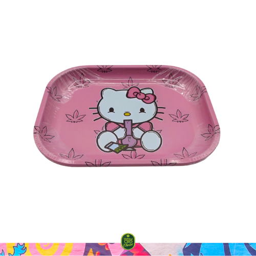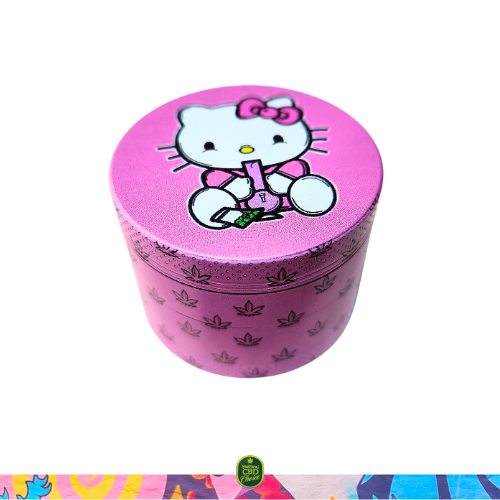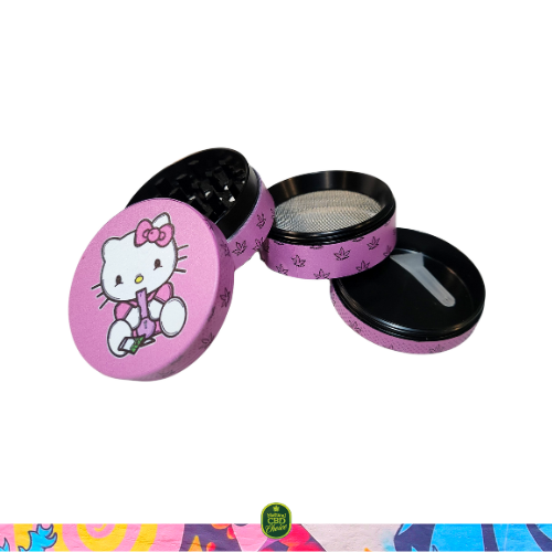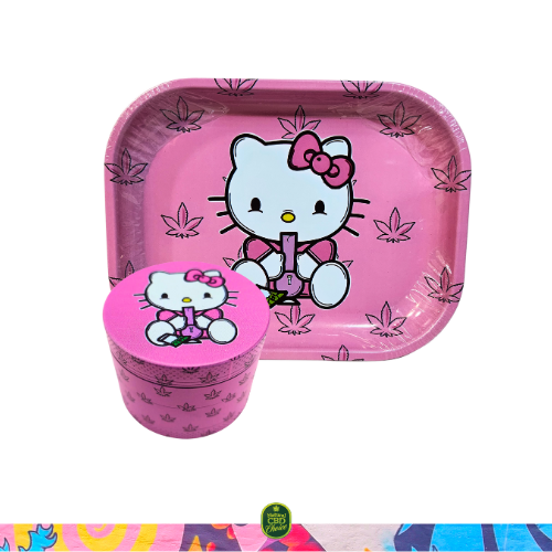 Este pack contiene una bandeja de metal con diseño Kitty rosa y un grinder de metal de 4 partes, con polinizador y espátula, del mismo diseño.